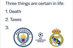 推文配文 “瞧瞧我们。谁能想到呢”,并附上一张玩梗图,将西方经典谚语“人生只有死亡和税收是确定无疑的”进行改编,新增了第三条“曼城在欧冠对阵皇马”。